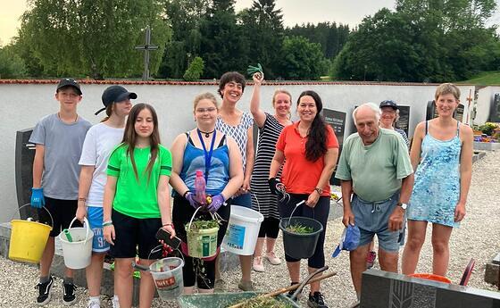 Einige freiwillige Jugendliche und Erwachsene beteiligten sich bei der Jät-Aktion im Friedhof.