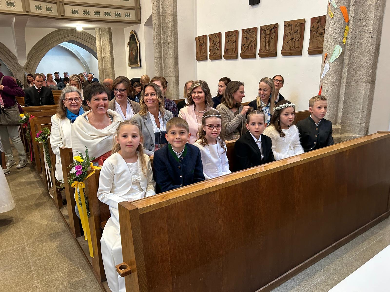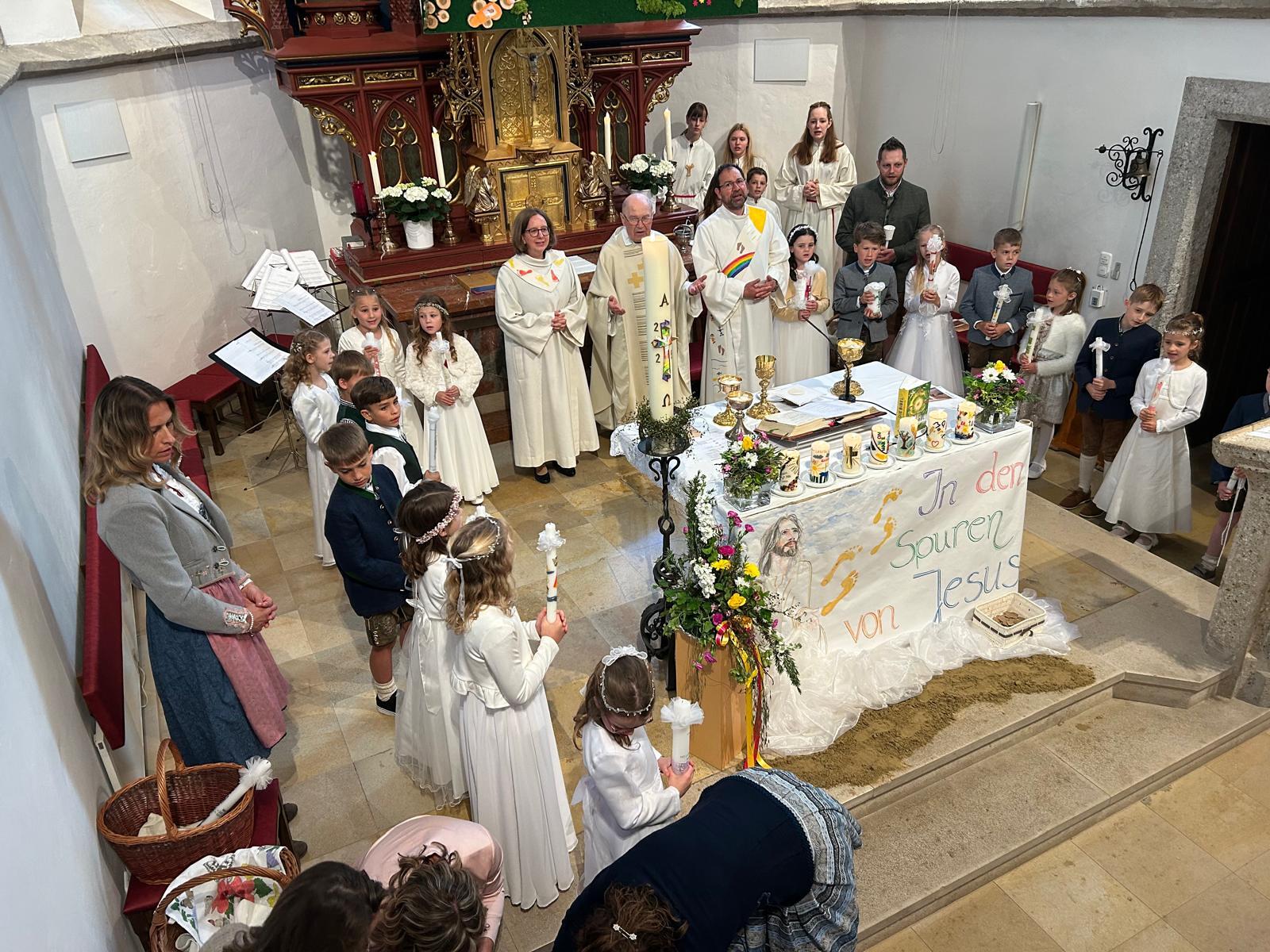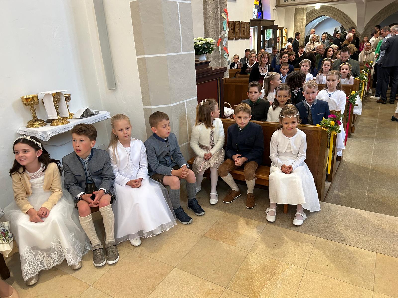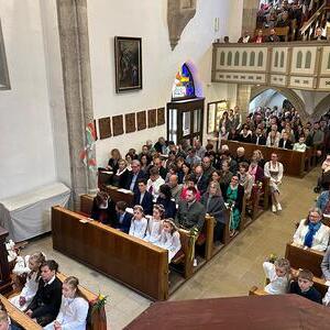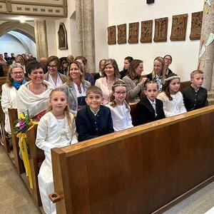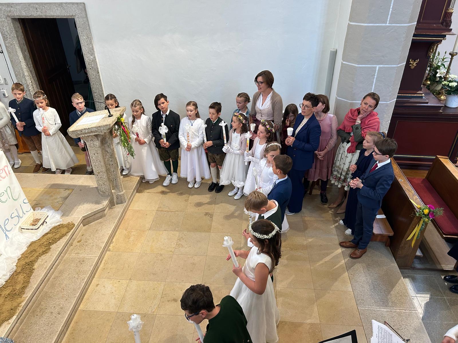 Voller Freude zogen die 31 Erstkommunionkinder von der Musikkapelle, den Tischeltern, den Lehrerinnen, den SeelsorgerInnen und ihren Familien und Angehörigen begleitet, in die festlich geschmückte Kirche ein. Pfarrer i.R. Alois Kainberger, Diakon Klaus Autengruber und Pfarrassistentin Anna-Maria Marschner, standen dem Gottesdienst vor. Seit Wochen hatte Religionslehrerin Sabine Stelzhammer die Kinder voller Begeisterung auf ihr Fest vorbereitet: Jesus lässt uns nie allein – erst recht nicht in den schweren Zeiten unseres Lebens. Er ist der Weg, die Wahrheit und das Leben. Diese Gewissheit war den Kindern ins Herz geschrieben, wenn sie beschwingt und fröhlich ihre Lieder sangen. Mögen die Kinder immer wieder spüren dürfen, dass Jesus das Brot des Lebens ist, das uns stärkt auf unserem Glaubens- und Lebensweg.