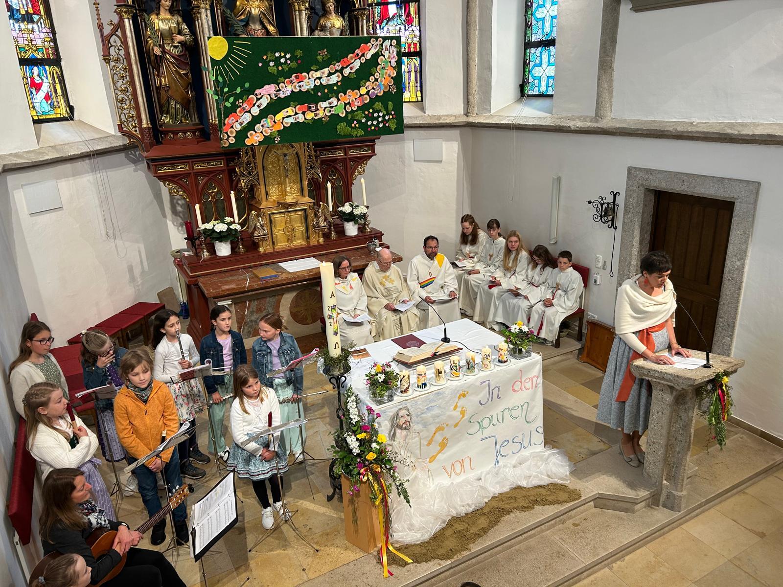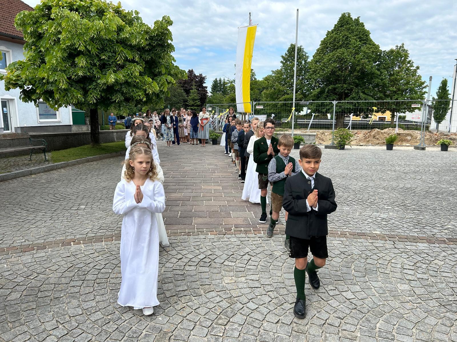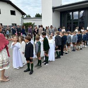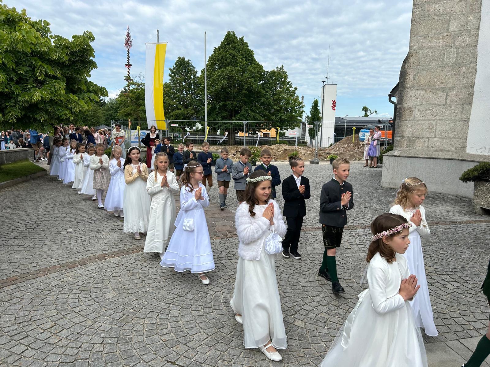 Voller Freude zogen die 31 Erstkommunionkinder von der Musikkapelle, den Tischeltern, den Lehrerinnen, den SeelsorgerInnen und ihren Familien und Angehörigen begleitet, in die festlich geschmückte Kirche ein. Pfarrer i.R. Alois Kainberger, Diakon Klaus Autengruber und Pfarrassistentin Anna-Maria Marschner, standen dem Gottesdienst vor. Seit Wochen hatte Religionslehrerin Sabine Stelzhammer die Kinder voller Begeisterung auf ihr Fest vorbereitet: Jesus lässt uns nie allein – erst recht nicht in den schweren Zeiten unseres Lebens. Er ist der Weg, die Wahrheit und das Leben. Diese Gewissheit war den Kindern ins Herz geschrieben, wenn sie beschwingt und fröhlich ihre Lieder sangen. Mögen die Kinder immer wieder spüren dürfen, dass Jesus das Brot des Lebens ist, das uns stärkt auf unserem Glaubens- und Lebensweg.