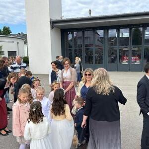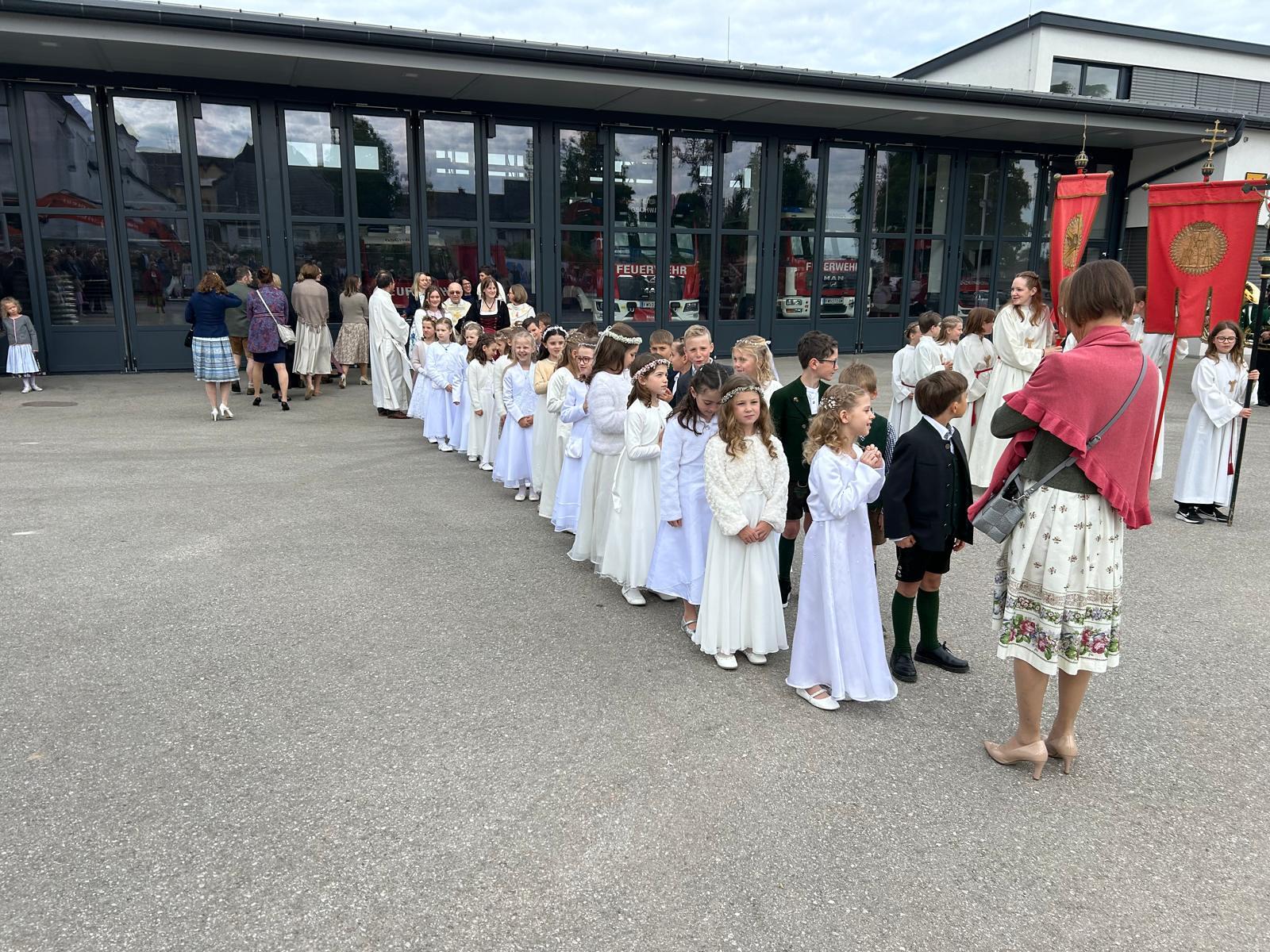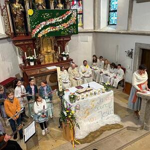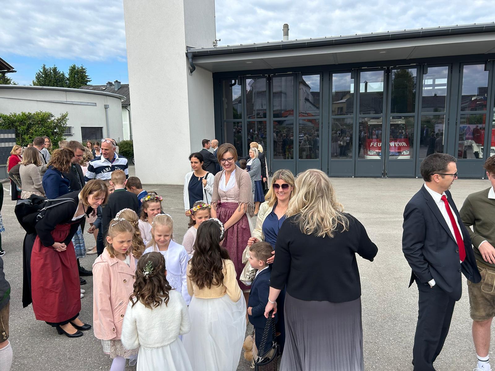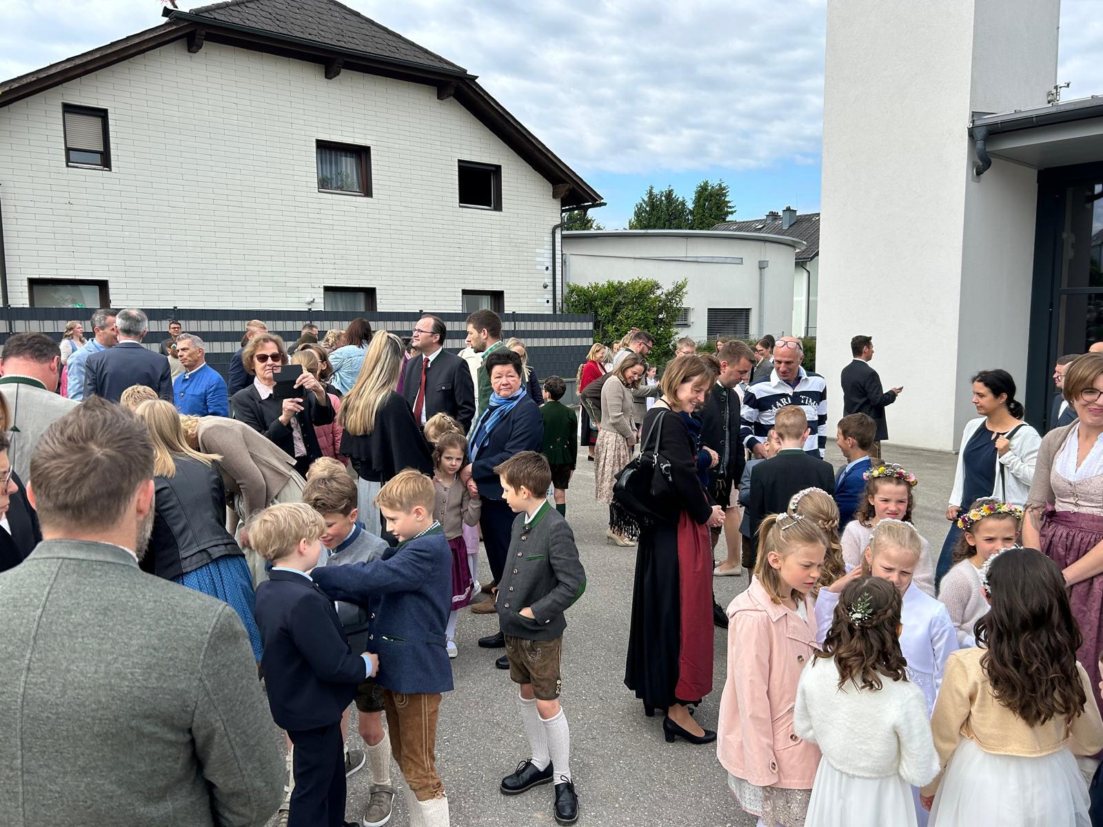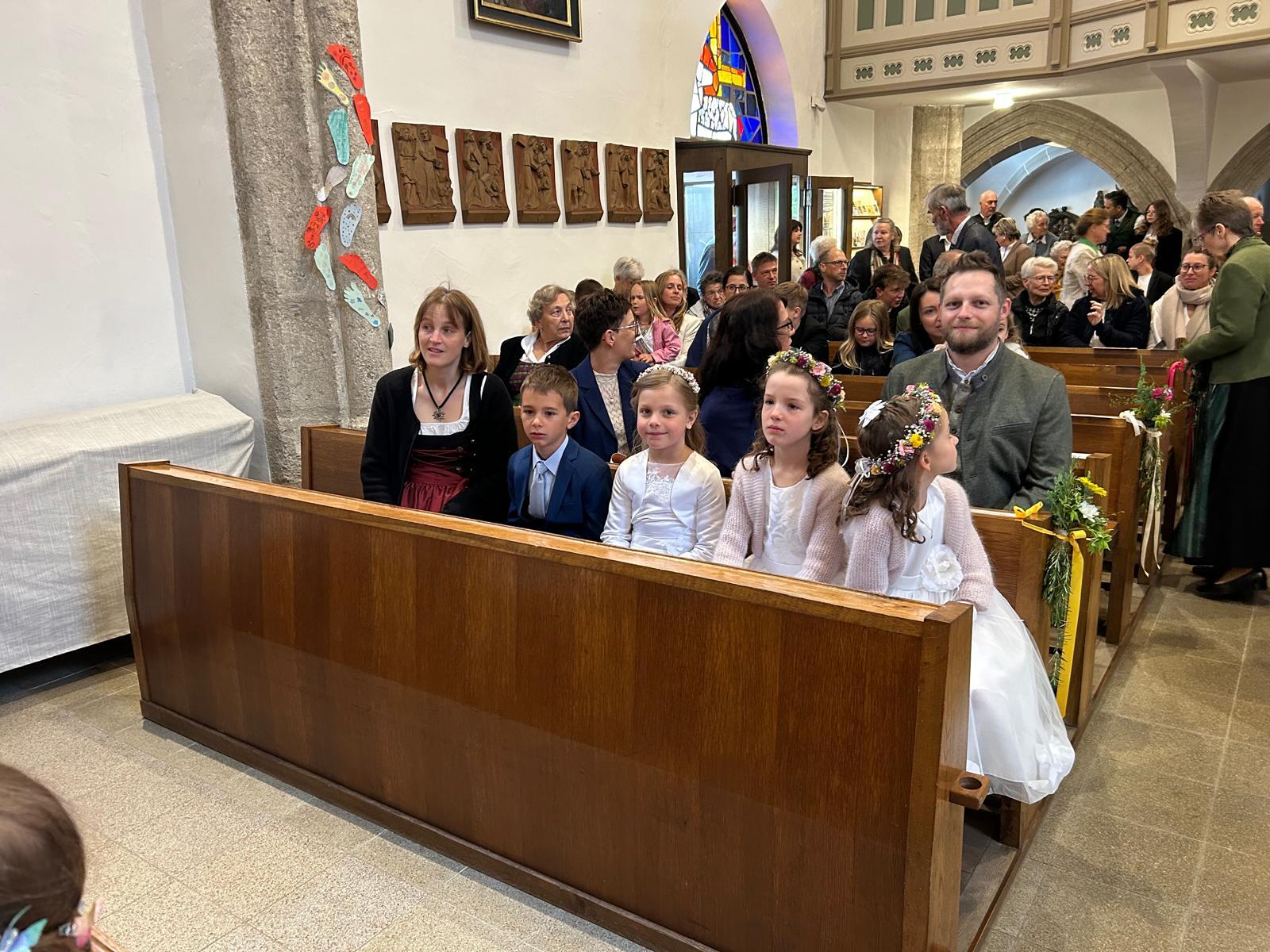 Voller Freude zogen die 31 Erstkommunionkinder von der Musikkapelle, den Tischeltern, den Lehrerinnen, den SeelsorgerInnen und ihren Familien und Angehörigen begleitet, in die festlich geschmückte Kirche ein. Pfarrer i.R. Alois Kainberger, Diakon Klaus Autengruber und Pfarrassistentin Anna-Maria Marschner, standen dem Gottesdienst vor. Seit Wochen hatte Religionslehrerin Sabine Stelzhammer die Kinder voller Begeisterung auf ihr Fest vorbereitet: Jesus lässt uns nie allein – erst recht nicht in den schweren Zeiten unseres Lebens. Er ist der Weg, die Wahrheit und das Leben. Diese Gewissheit war den Kindern ins Herz geschrieben, wenn sie beschwingt und fröhlich ihre Lieder sangen. Mögen die Kinder immer wieder spüren dürfen, dass Jesus das Brot des Lebens ist, das uns stärkt auf unserem Glaubens- und Lebensweg.